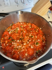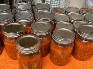 It takes a full day to make the sauce: blanching tomatoes, making sure you have enough new lids for each can, determining which vegetables and flavors to add to the pot, cutting and chopping and mixing, and then the long stewing process on a low cook temperature, followed by preparing the cans and then boiling them for 35-40 minutes to seal the lids.