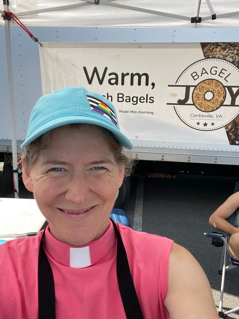 My name is Jo Dietz (she/her). I am an ordained deacon in the United Methodist Church. A deacon creates bridges between the world and the church. I worked in the church for many years, but I was always seeking those who did not feel comfortable within the church walls. So I took a radical step and asked to be appointed to serve out in the community – specifically through my neighbor’s fledgling bakery, Bagel Joy. (Currently found at local markets in Northern VA)